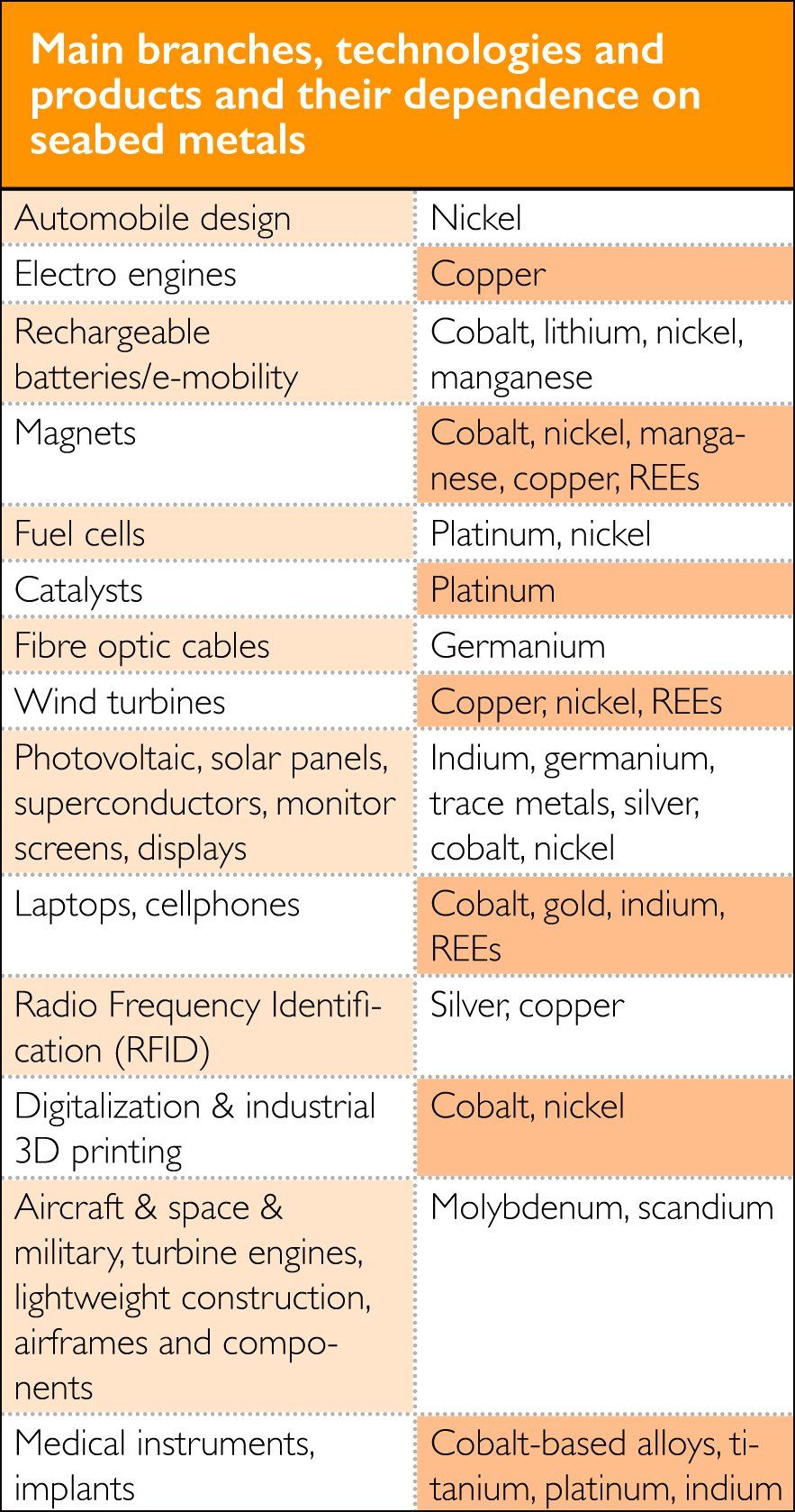 Alle drei polymetallischen Erze aus der Tiefsee (Manganknollen, Massivsulfide und Kobaltreiche Krusten) weisen hohe Konzentrationen an Metallen auf, die für die zukünftige globale wirtschaftliche Entwicklung notwendig sind. Alleine in der produzierenden Industrie (z.B. Elektromobilität und regenerative Energiegewinnung) gibt es aktuell und zukünftig einen sehr hohen Bedarf an Kobalt, Nickel, Kupfer und Mangan. Abhängig vom Typ der marinen Rohstoffe enthalten die Erze darüber hinaus Spurenmetalle wie Gold und Silber und – als Nebenprodukte – Seltene Erden in bedeutenden Qualitäten und Gehalten. Die diesbezüglichen Explorationsergebnisse sind insbesondere für Massivsulfide sehr vielversprechend – diese Nebenprodukte sind geeignet, die Rentabilität der zu entwickelnden Technologien für den Tiefseebergbau zu steigern.